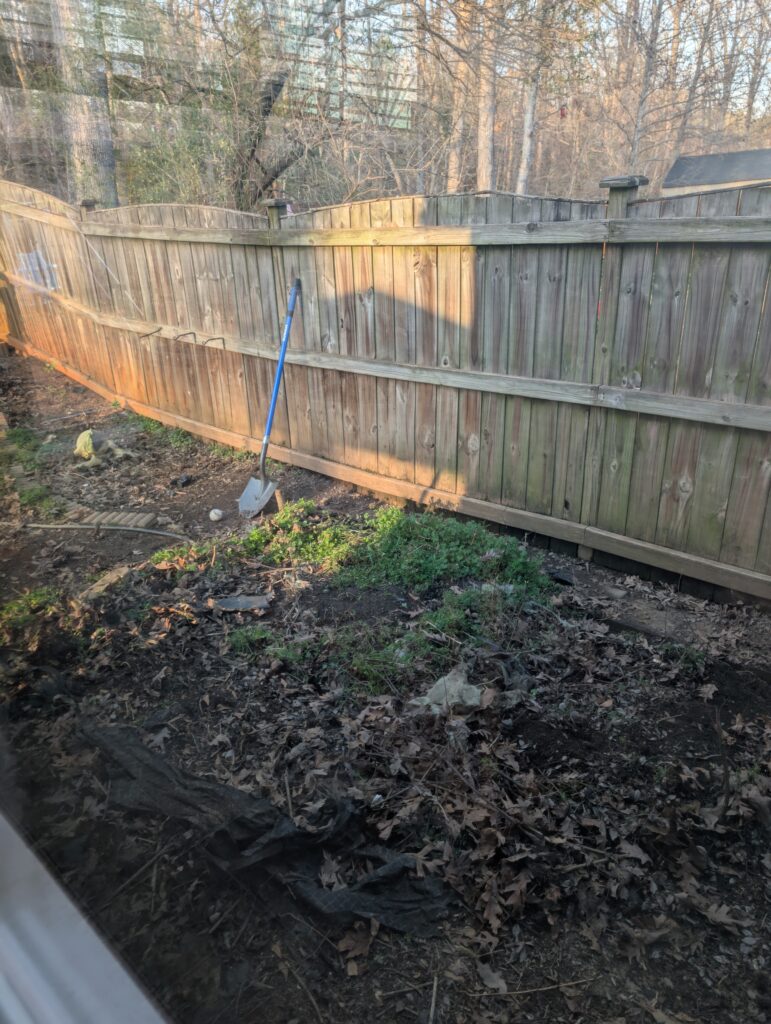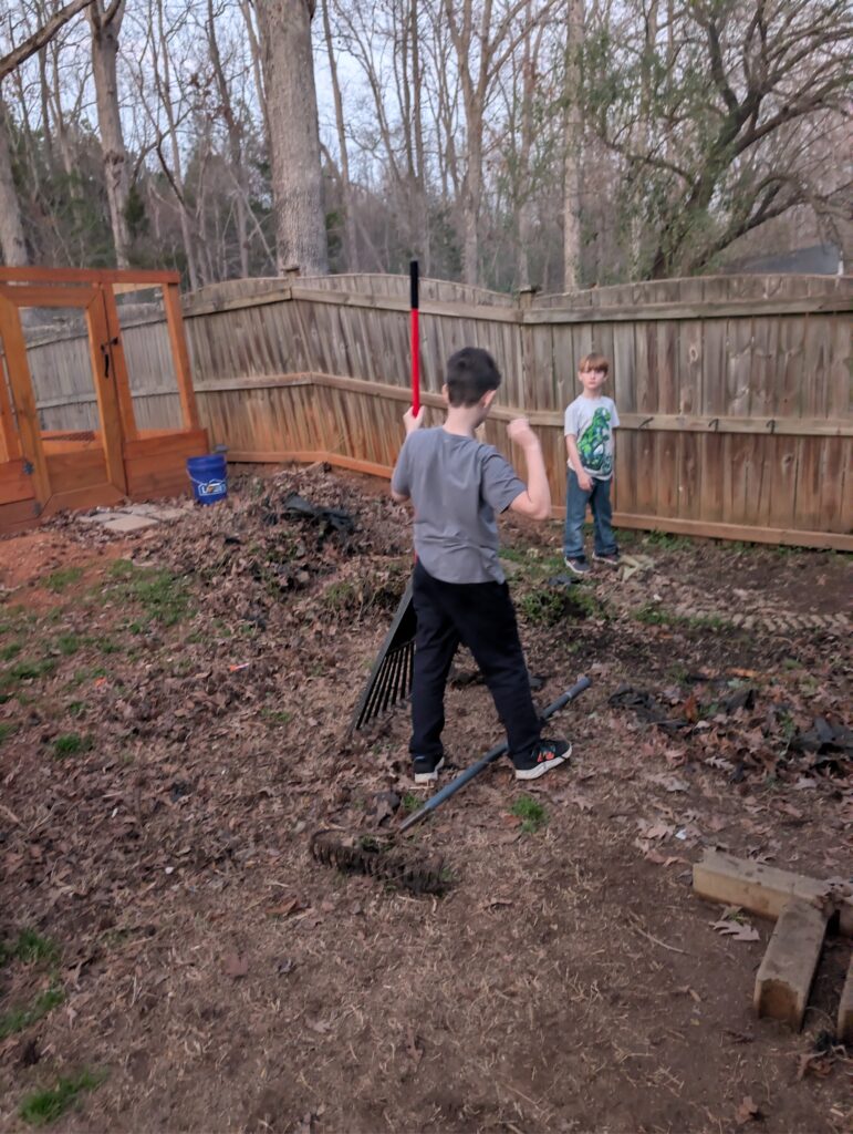 After dinner we all headed outside and started prepping the space for the butterfly garden.My husband tackled the back-breaking job of tearing out the old raised bed that had rotted through. The boys picked up trash and did a lot of raking. I worked on pulling out old roots and vines that had taken over the space.